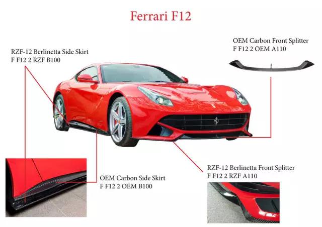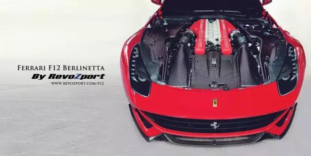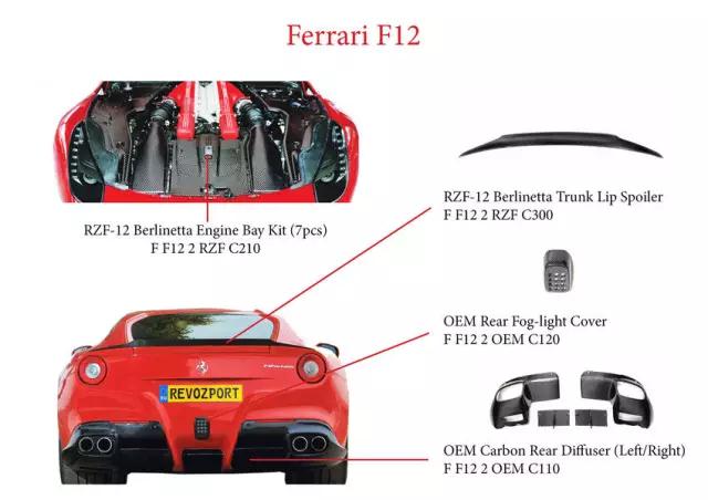 F12 berlinetta的造型设计由法拉利造型中心与宾尼法利纳联手打造。无以伦比的空气动力学特性与和谐优雅的车身比例在F12berlinetta身上得到完美糅合,彰显了法拉利V12前置发动机车型的独特气质。这款REVOZPORT的碳纤维空力套件是专门为F12研发,包括前唇、侧裙、后扰流板、发动机罩、小尾翼。