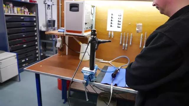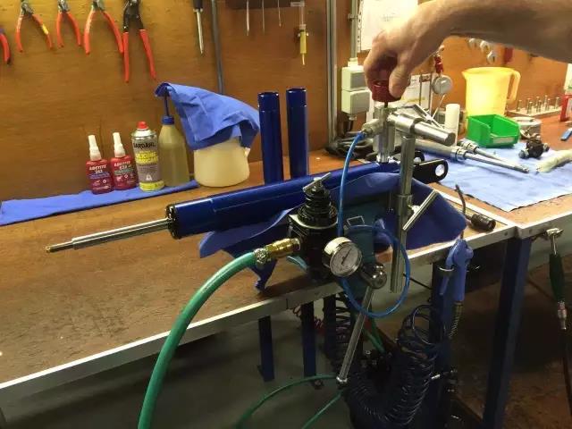 以下正在为一套RS Pro避震机进行抽真空加油,由于RS Pro系列避震为单桶设计,所以必须将其内部空气完全抽空,才能灌油,同时需要机器来完成工序。