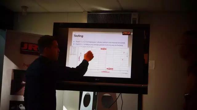 JRZ技术总监Eric讲解避震测试时,阻尼油的阻尼大小对于压缩与回弹量的影响。