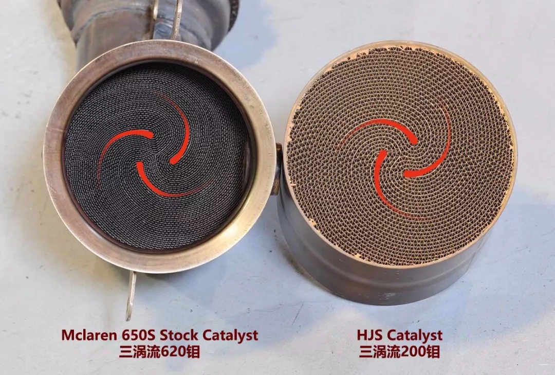 上图左侧为一流超跑迈凯轮650S原厂三元催化头段,。虽然同样出自HJS并且具备了HJS的三涡流技术,但作为OEM的产物原厂为620钼。