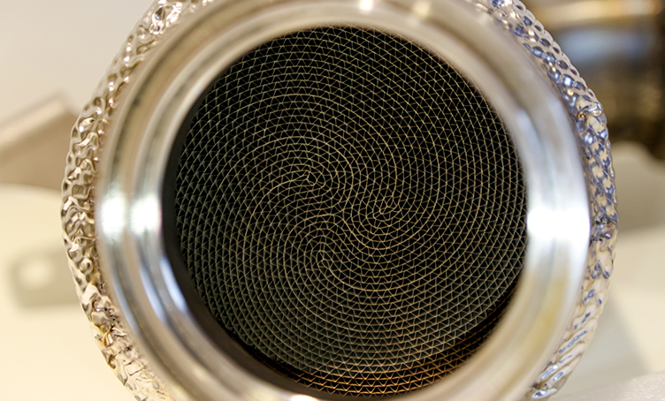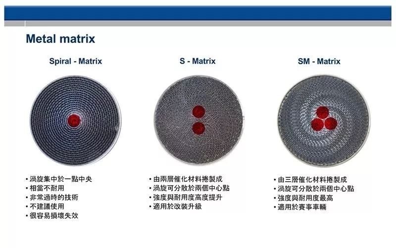 (此技术由三层催化材料卷制而成,能够将排气温度有效分散在三个点均匀扩散,使得加强流量的同时强度及耐用度最高化),