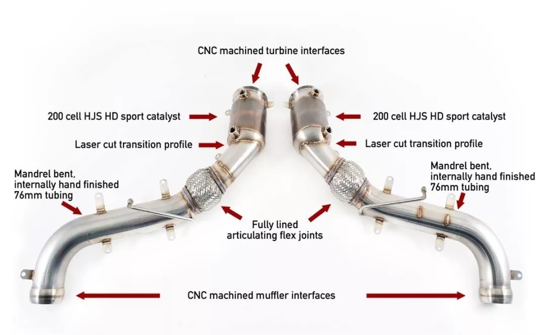 业内公认最好的。HJS高性能三元催化头段100%由不锈钢制成,德国制造。在同等品质和排放标准中,你将找不到比HJS提供更大流量的