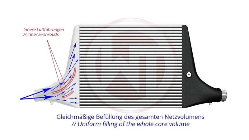 而且,这款车型拥有奥迪强悍(04玩家最爱)的Quattro四驱系统,让这款奶爸车型拥有了不容小觑的动力表现。 国外一名车友为了让这款具备性价比、性能、家用的车型,在动力上更加出色对引擎进行了一项升级作业。 在这款引擎的改装作业中,车主选择了1阶程序以及来自德国的WT中冷,作为一款V6涡轮增压车型,WT对其的提 升十分重要。相比原厂的中冷套件,WT中冷的空气容积比原厂增加了134%,增压空气量增加了105%。 除了整体的升级以外,在中冷的出入口也选择了更大直径的接口提升空气流通。并且采用了WT所特有的隔热涂层, 保证长期优质冷却状态。完全准备安装的套件,只需替换为串行中冷器即可即插即用,并且经过试验最高可承受 6 Bar的增压数值。 原厂中冷数据: 720mm x 145mm x 80mm V=8,35 Liter A=1044 cm2 WAGNERTUNING中冷数据: 550mm x 445mm x 70mm V=17,13 Liter A=2447 cm2 尽管相比原厂中冷大了许多,但是整体重量仅为9.5kg。这也得益于中冷本体由铸铝制成,并借助CFD系统中的流量 分析进行了优化。WT的产品都受到严格的质量监控,高质量出品保证产品在赛事规格中也同样受用。 经过1阶程序以及WT中冷的加持,357Hp/752Nm的强劲动力让这款奶爸最爱的奥迪A6也同样晋升到高性能德系涡 轮车的阵营中。