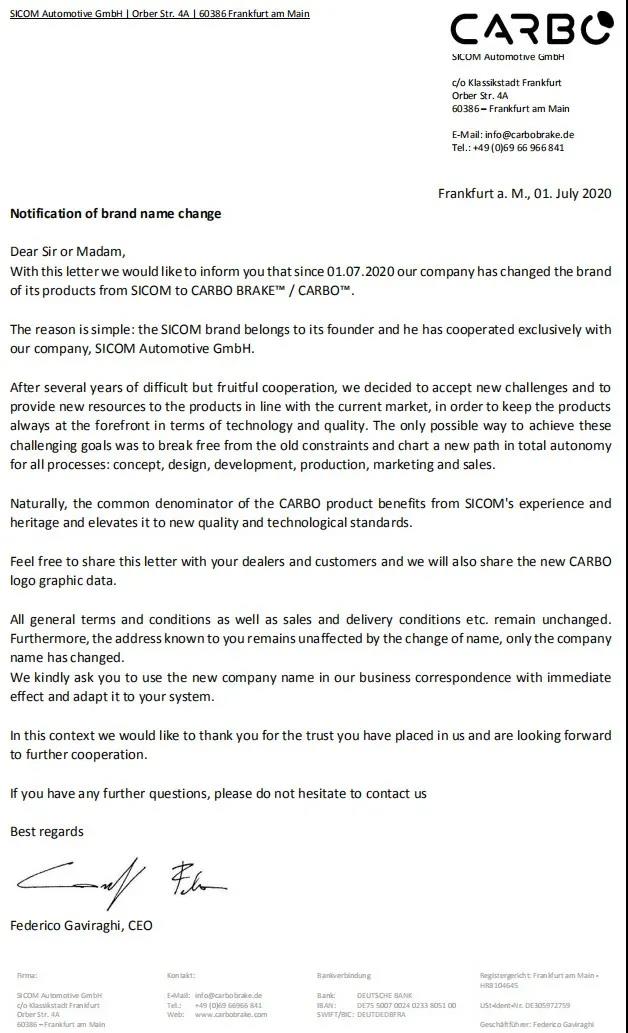 SICOM品牌是由的创立者所拥有,我们与SICOM合作关系是SICOM Automotive GmbH - 独家合作。 经过几年艰难且有成效的合作,我们决定接受新的挑战,为产品提供符合当前汽车市场的新资源,让产品在技术上 和质量上始终处于领先地位。达到这个富有挑战性的目标的方法是,打破旧的约束,开创一条新道路,在以下所有 流程上都能完全自主的概念、设计、开发、生产、市场以及销售。 前提,CARBO产品得益于SICOM的经验和传承,会把质量和技术提升到一个新的高度。 这封信请大家广而告之,我们也会把CARBO标志的陆续呈现给大家。 所以,我们的条款和销售及交货条件均保持不变。而且,我们的地址也没有变化,只有公司名称改了。
