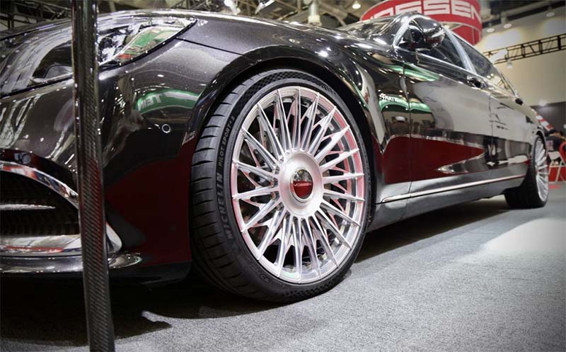 另一辆展车迈巴赫S450,则是改装了VOSSEN主打豪华气质的S17系列旗下的S17-15T。这款轮毂的多辐条设计适合豪华