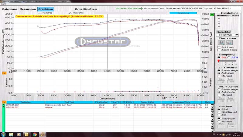 经过Capristo排气的升级,718 Spyder / Cayman GT4的动力能够获得提升,同时高转的声浪也会更高亢。在数据图