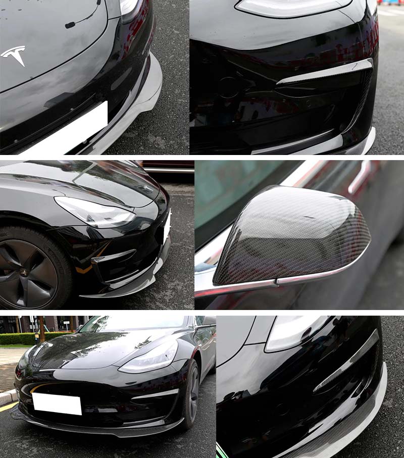 Gratech的产品采用日本进口的碳纤布,在纹路上十分清晰整洁。本次案例的Model 3车身颜色是黑色,装上这几款