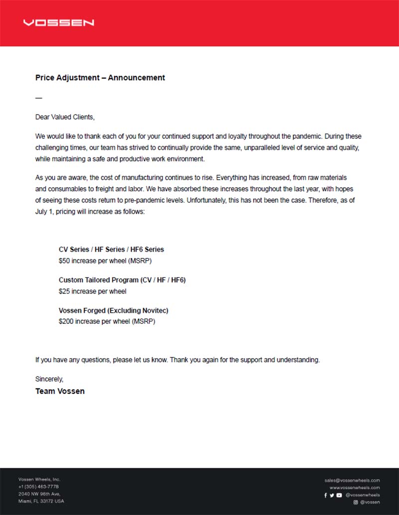 尊敬的客人们:非常感谢对美国VOSSEN产品一如既往的支持与信任,因生产成本,物价,原材料,运输等成本的上涨,