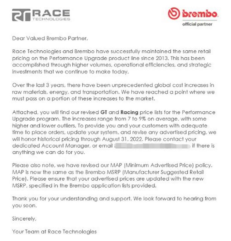 Race Technologies and Brembo have successfully maintained the same retail pricing on the Performance