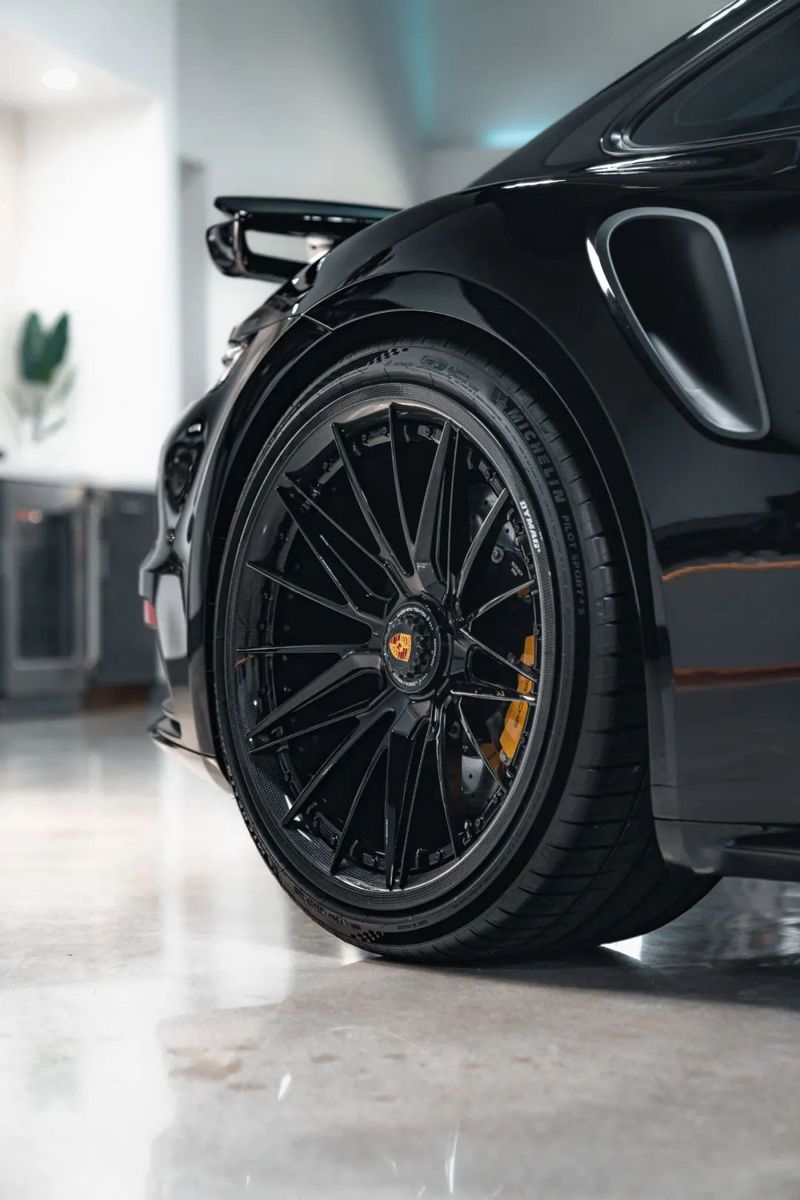 案例中的992 Turbo S升级CF-D017轮毂,采用的是前21x9.5后22x12.5的数据,颜色为Gloss Black,