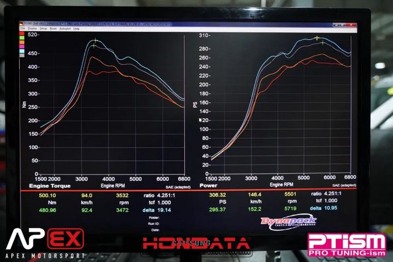 CIVIC TYPE R(FL5)中规版本 测试条件 日期:2023/08/01 天气:晴 气温:37°C 马力机:DYNA PACK (TCF 1.0) 档位:4档 汽油:98 硬件配置 进气空滤:SPRINT FILTER 排气头段:HJS 200钼三元 排气前管:HJS 排气中尾:JS RACING(测试版) 程序:HONDATA 升级前后数据对比 1. 原厂硬件(红色):250PS / 364NM 2. 原厂硬件+HONDATA程序(橙色):269PS / 438NM 3. 更换HJS 200钼三元头段+HONDATA程序(紫色):295PS / 480NM 4. 更换全段排气+SF高流量进气空滤+HONDATA程序(蓝色):306PS / 500NM 案例鸣谢:上海SRT-548d14ca-a1a8-4398-8315-72f4d3d0558f.jpg)