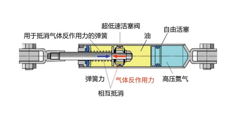工作仓结构包括了弹簧、液压油和高压氮气,即使是微弱的车身变化,弹簧、液压油和高压氮气三者都将一起进行工作,