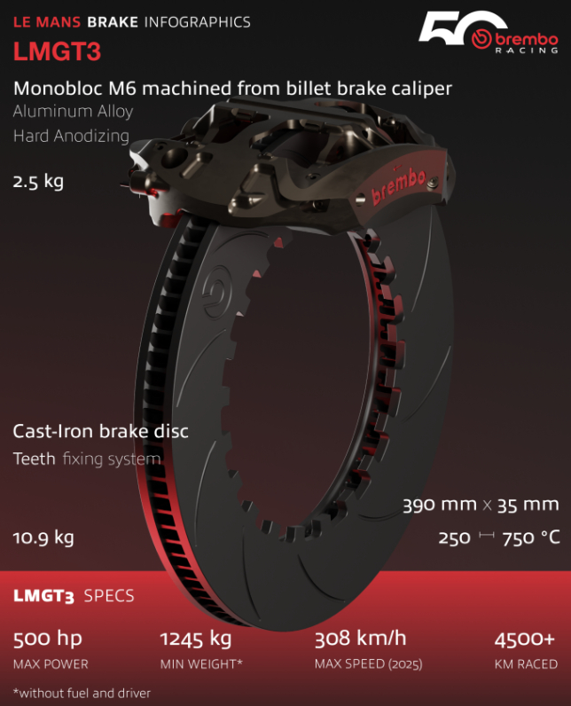 LMGT3 组别赛车使用铸铁刹车盘(规则禁止使用碳纤维材料),规格为直径390毫米、厚度35毫米,刹车环通过多齿耦合