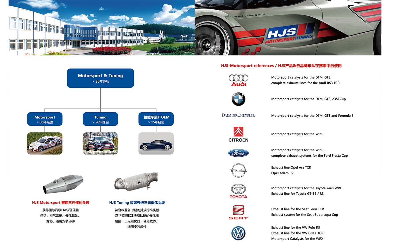 HJS motorsport 是针对汽车赛事和改装而设立的部门,从1990年开始,HJS就已开发并生产用于赛车运动的三元催化头段产品,其产品亦得到了德国汽车运动联合会(DMSB)和国际汽联FIA的认可。其TUNING系列的三元头段产品则是HJS motorsport部门针对民用市场汽车性能的提升,技术则传承自HJS专业赛事产品的改进。国际上知名的排气系统品牌,三元催化器部分往往都是采用HJS的产品。