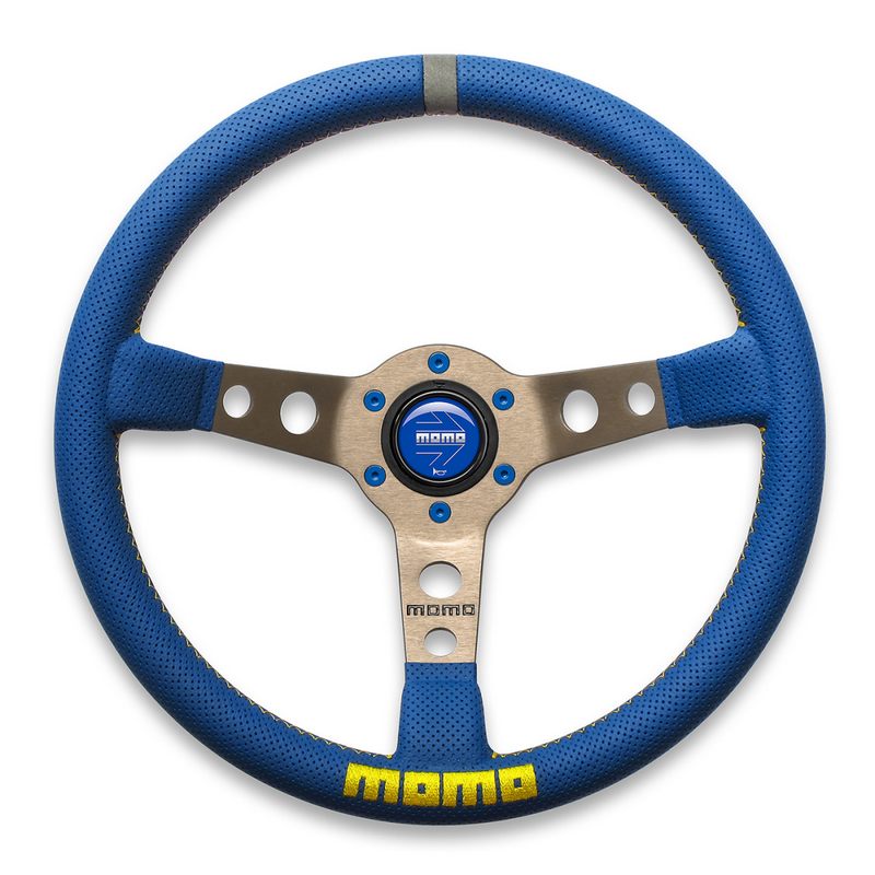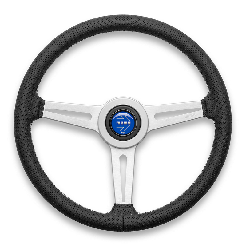 PROTOTIPO Steering Wheel: The ideal choice for classiccars across all generations. Featuring a 350 mm diameter, 37 mm depth, and a33x33 mm grip, its distinctive and timeless design makes it perfect forlong-distance drives or high-performance GT sports cars. The iconic perforatedspokes enhance the steering feel by reducing weight. Laser-etched "Prototipo" lettering on the standardspoke and the embossed MOMO logo on the horn button add refined details andcharacter to this classic MOMO steering wheel.