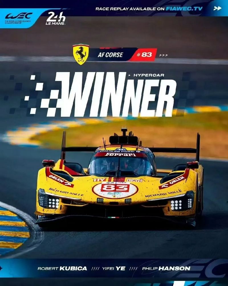 上周末,第93届勒芒24小时耐力赛落幕。Hypercar组别的83号法拉利499P赛车率先冲过终点线夺得冠军。