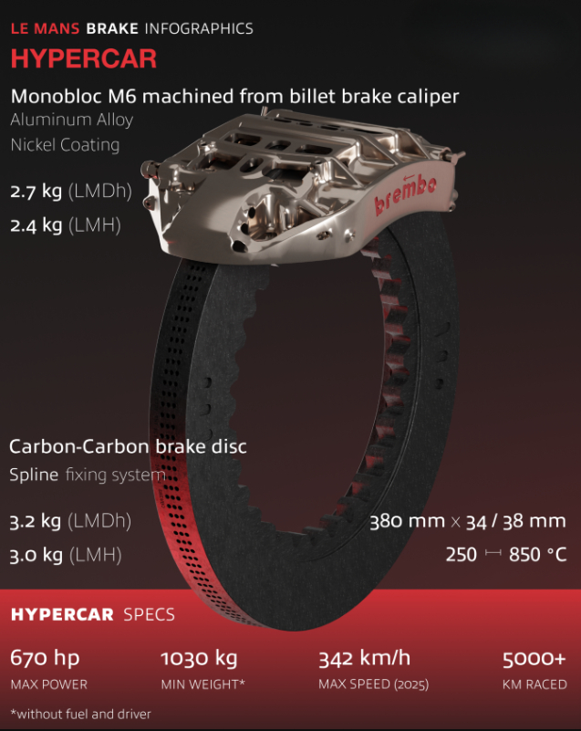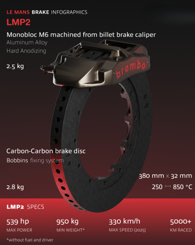 目前的勒芒24小时耐力赛包含Hypercar、LMP2 和LMGT3 三个组别,Brembo 为每个组别均提供了专业的赛车